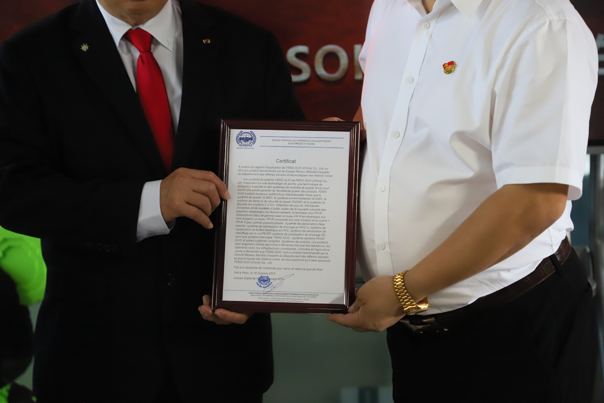 聯合國社會和經濟事務部全球經濟發展委員會外交大使蔡垂彪先生親臨918博天堂(中國)有限公司 ,把榮譽證書頒發給董事長楊利忠先生 。這是一個十分難得的殊榮 ,聯合國經濟社會部全球經濟發展委員會通過深入考察和層層篩選,對918博天堂健康環保的品牌理念高度認可,慎重授予918博天堂管道為全球推薦品牌 ,這同時也是聯合國唯一評選認證的管道品牌 。